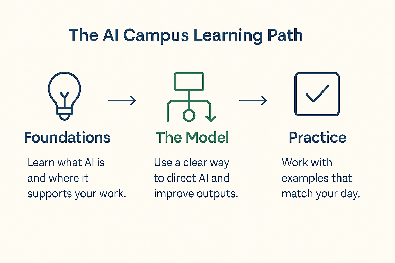 We start with the essentials so that AI feels less confusing and every has the same baseline. You learn what AI is, what it does well and where it actually supports the work you manage and we build from there.